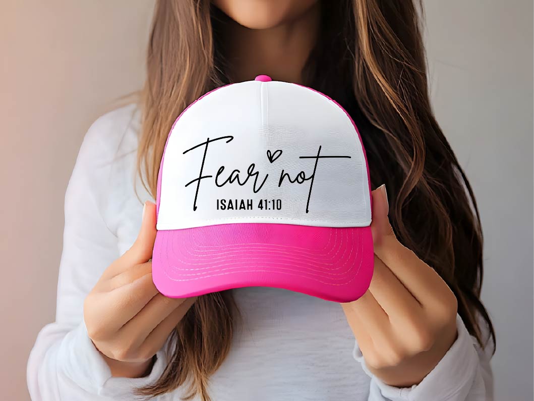 Fear Not Isiah 41:10 Trucker Hat Pink/White